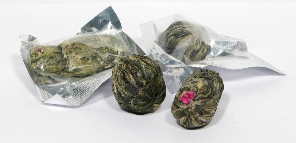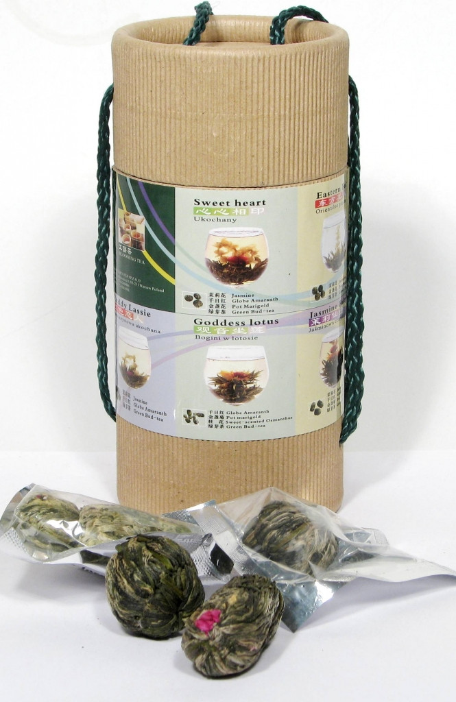 Zestaw dziesięciu herbat kwitnących w pudełku prezentowym, każda kulka pakowana hermetycznie w Chinach.