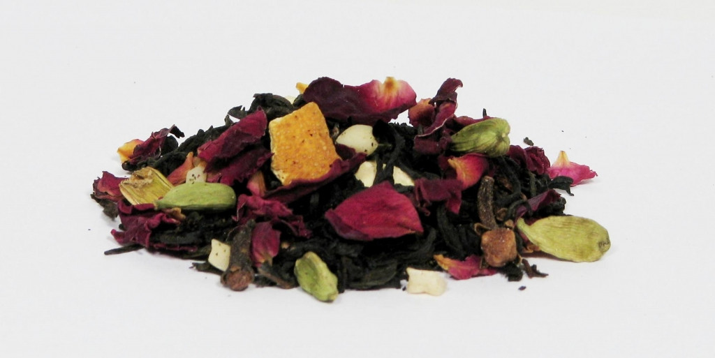 Składniki: czarna herbata, pomarańcza, kawałki orzechów arachidowych, goździki, kardamon, płatki róży, aromat