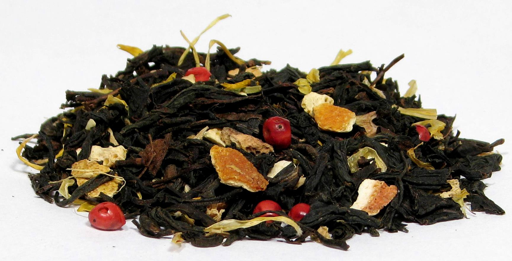 Składniki: herbata czarna liściasta, kawałki imbiru, skórka pomarańczowa, pieprz czerwony, kwiat akacji, kwiat nagietka, aromat