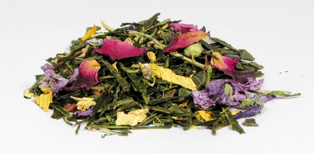 Składniki: herbata zielona Sencha, płatki róży, malwy i słonecznika, aromat mango i bergamotki