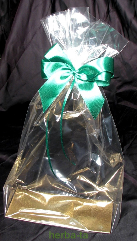 Komplet do pakowania prezentów składający się z: torebki foliowej z rozkładanym dnem o wymiarach: 24,8*7,5/40cm, sztywnej, prostokątnej podkładki dwustronnej złoto-srebrnej oraz tekstylnej kokardy (dostępne kolory złoty i czerwony, niebieski, zielony, oraz wiosenne: żółty, pomarańczowy, seledynowy). Podczas zamawiania prosimy o wybór koloru kokardy.