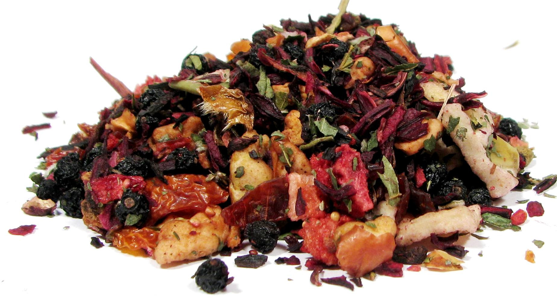 Składniki: jabłko, owoc dzikiej róży, hibiskus, owoc żurawiny, owoc czarnego bzu, liść jeżyny, truskawka i malina liofilizowana, aromat