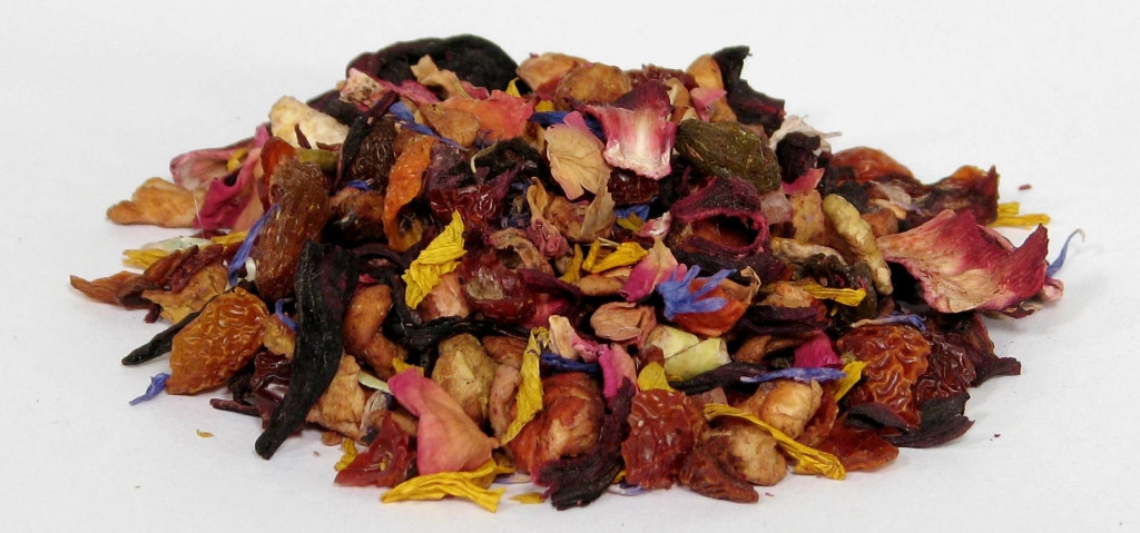 Składniki: jabłko, hibiskus, dzika róża, skórka pomarańczowa, mango, papaja, rodzynki, płatki róży, bławatka i słonecznika, aromat