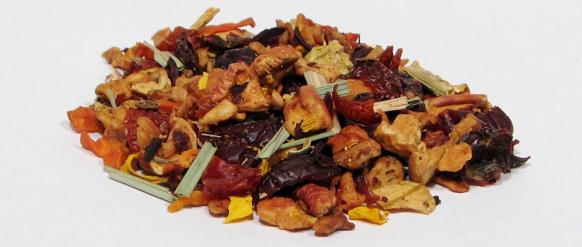 Składniki: jabłko, hibiskus, owoc dzikiej róży, marchewka, kandyzowane owoceżurawinowy, kwiaty słonecznika, trawa cytrynowa, aromat