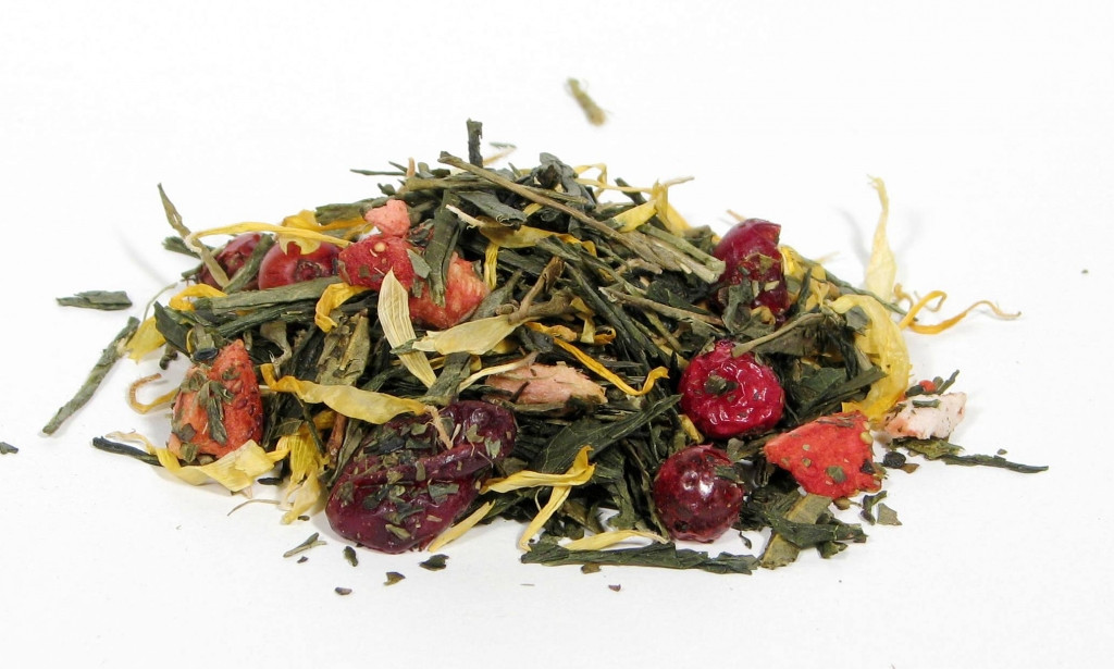 Składniki: herbata zielona Sencha, owoc żurawiny, truskawki i czerwona porzeczka liofilizowane, nagietek, aromat
