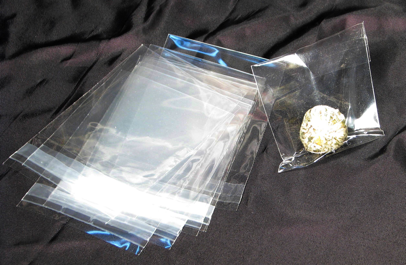 Torebki z przeźroczystej folii, z paskiem klejowym, do pakowania pojedyńczo herbat kwitnących.